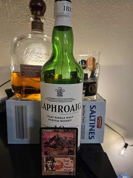 Personal opinion, nothing pairs with Sarpadia (or OS mtg) more than a little neat Laphroaig – a perfect match with dark peaty notes of seaweed and smoke. Cheers.